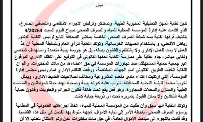 تدين نقابة المهن التحليلية المختبرية الطبية، وتستنكر وترفض الإجراء الانتقامي والتعسفي الصارخ، الذي أقدمت عليه إدارة المؤسسة المحلية للمياه والصرف الصحي صباح اليوم السبت 4 أبريل 2026م، بتكليف فرقها الفنية بسد شبكة الصرف الصحي الخاصة بمختبر الصداقة التابع لرئيس النقابة الدكتور رياض الأكحلي، وبإستخدام الصبات الخرسانية، تحت حماية أطقم أمنية.